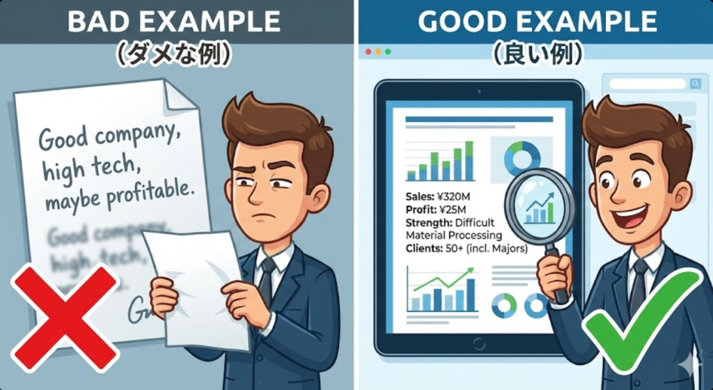 - 全てが抽象的: 「長年の実績」「技術力に自信」「大手との取引」など、耳触りの良い言葉が並んでいますが、具体的な事実が一つもありません。買い手は「本当か?」と疑ってしまいます。