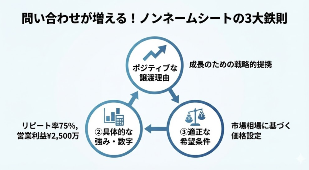 では、買い手(買収を検討している企業や個人)は、ノンネームシートのどこを見て判断しているのでしょうか? 重要なのは次の3点です。